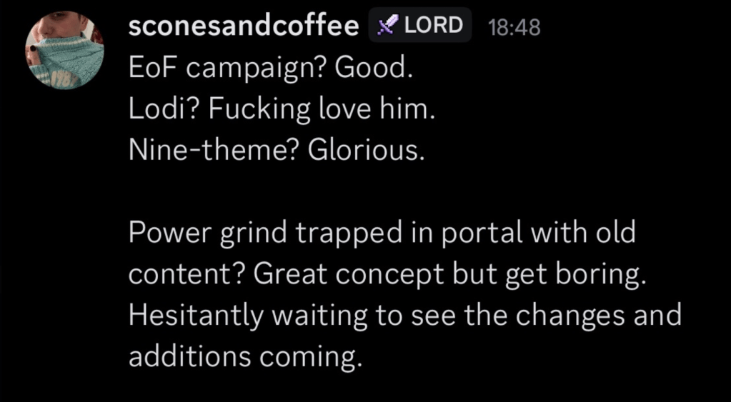 Overall, Edge of Fate has strong framing (again, we are not including that fateful TWID), but the rest of the metaphorical house is not built yet. And I, as an avid fan, am sitting back and waiting to see what they build. I may critique Destiny 2, but it’s one of my great loves and I only voice my thoughts because I love it and care so much for it. I think Edge of Fate is a great step forward, but it remains to see where this marathon (get it..) is going to take us.
