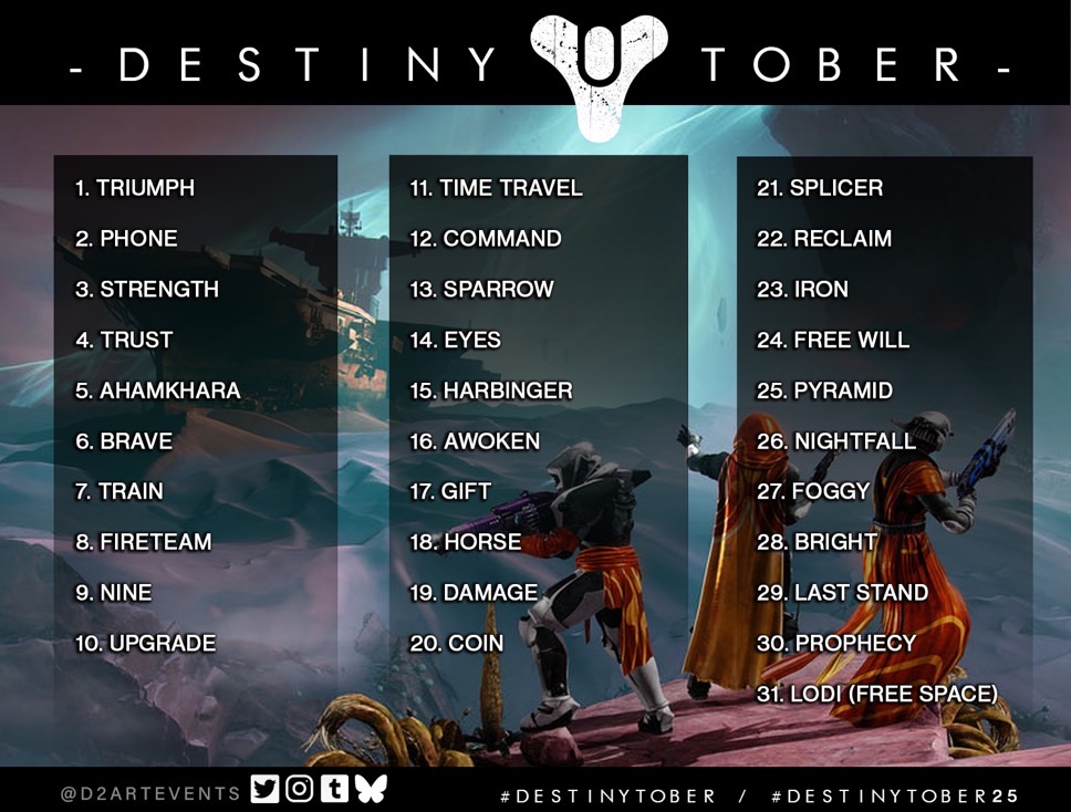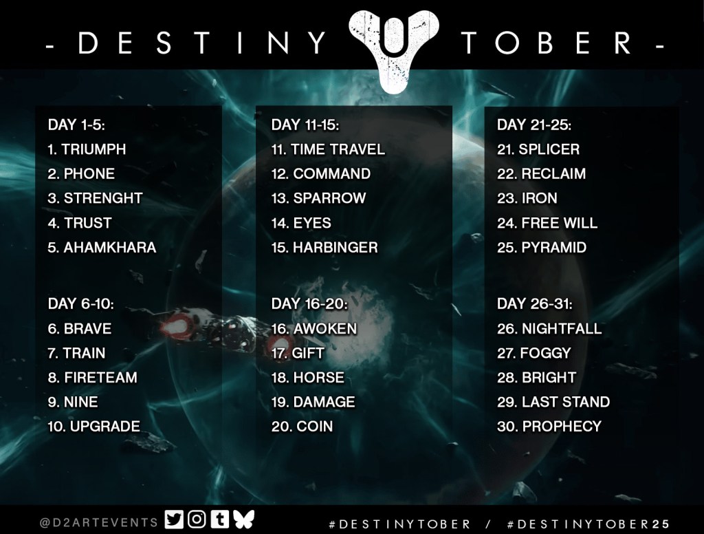 (It’s Destinytober time, which means I am following daily prompts for short, “one shot” style pieces about my current OCs in Destiny 2. I’ll post the month of prompts below in case anyone is interested in participating. You can write, draw, or any other form of art you yourself find appealing. One image is daily prompts, while the other are in sets of five days if you do not have the time or want to do daily pieces.)